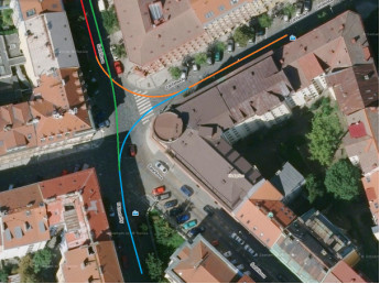Vjezd do obratiště nám umožňuje pouze ve směru od Tylova náměstí rozjezdová elektromagnetická výhybka ev.č. 317 s pružnými jazyky. Trať pokračuje rovným úsekem v podobě klasické dvoukolejné tratě Šafaříkovou ulicí až k Záhřebské ulici. Do ní vjezdová kolej odbočí levým obloukem a překříží výjezdovou kolej z obratiště. Následuje zajišťovací výhybka, jejíž čepové jazyky tramvajový vlak při příjezdu vždy rozřízne a ty se samy přestaví zpět do druhého směru. Na přímé kusé koleji v Záhřebské ulici je umístěna výstupní zastávka. Řidič zde přejde na zadní stanoviště tramvajového vlaku a levým obloukem couvá přes Šafaříkovu ulici do ulice U Zvonařky, kde je druhý vrchol trojúhelníku v podobě druhé kusé koleje. I zde musí koly rozříznout čepové jazyky zajišťovací výhybky, které se po jeho průjezdu samočinně vrací do druhého směru, na výjezdovou kolej. Řidič se vrátí do čela vlaku a vyjíždí z manipulačního prostoru, překříží oblouk vjezdové koleje do Záhřebské ulice a zhruba v polovině Šafaříkovy ulice je umístěna nástupní zastávka. Výjezdová kolej pokračuje souběžně s vjezdovou v podobě dvoukolejné trati Šafaříkovou ulicí až ke křižovatce s ulicí Bělehradskou, kde se ve výhybce s pružnými jazyky napojuje na tramvajovou trať.